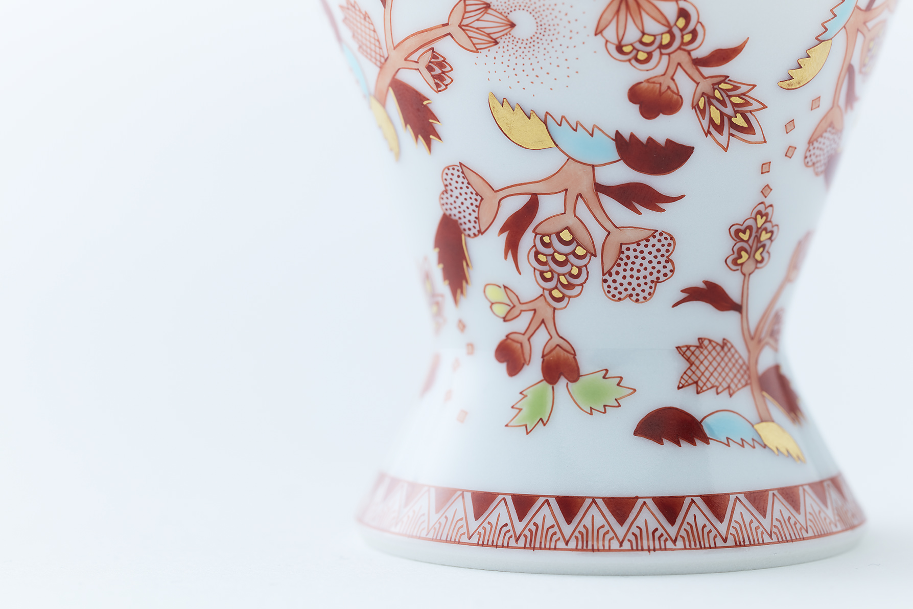 Since the patterns are painted in red alone, they stand out against the white porcelain, and they’re painted with red iron oxide taken from the soil using the tips of extremely thin brushes.